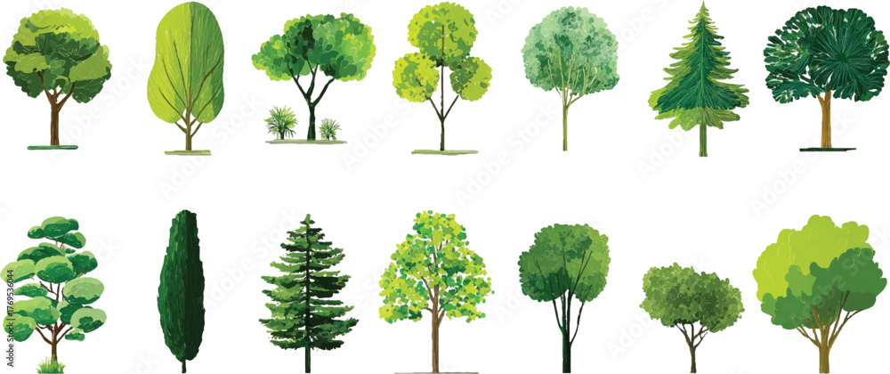 Tableau sur toile Minimal style cad tree line drawing, Side view, set of graphics trees elements,