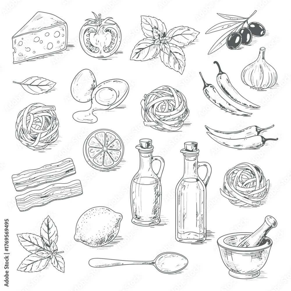 Tableau sur toile Hand drawn sketch of assorted fresh ingredients and cooking utensils for healthy