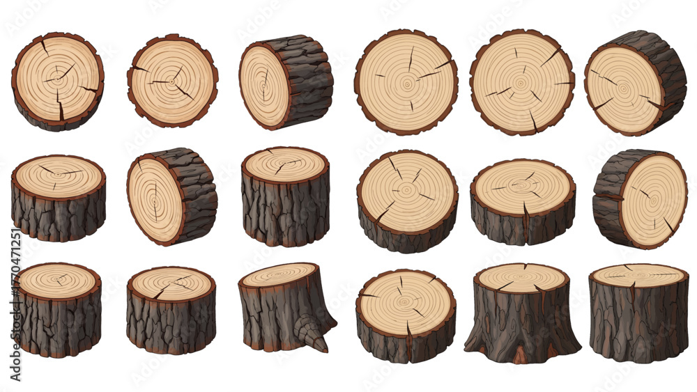 Tableau sur toile A collection of illustrated wooden logs, tree stumps, and round slices from different angles, showing bark and annual rings