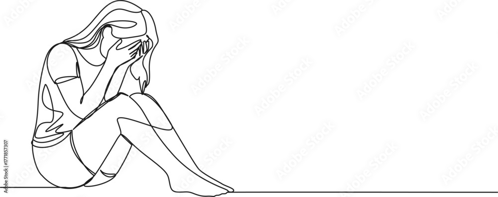 Tableau sur toile continuous line drawing of sad sorrowful female teenager or young woman sitting