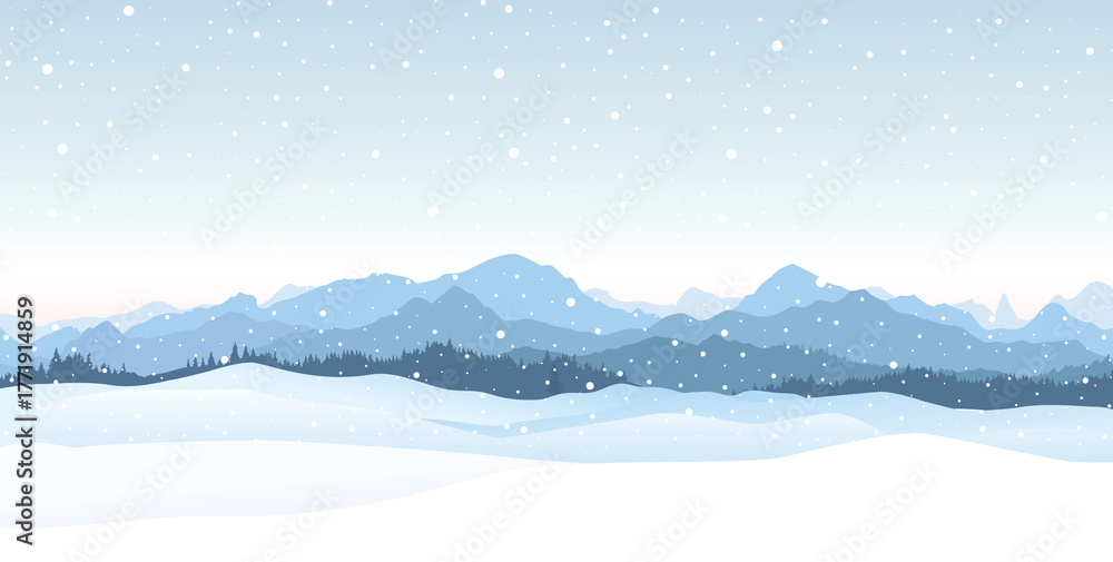 Tableau sur toile Winter forest snowfall landscape with mountains