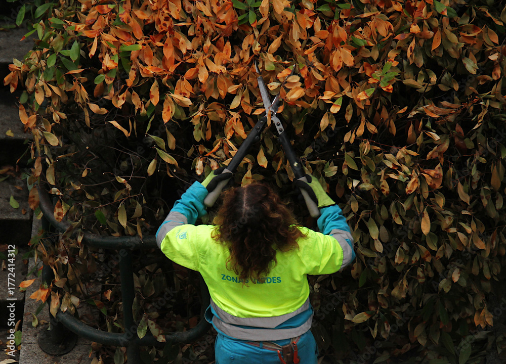 Tableau sur toile Mujer operaria jardinera de zonas verdes y mantenimiento en otoño podando y cort