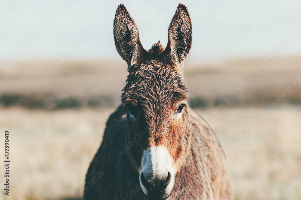 Tableau sur toile Donkey Farm Animal brown colour at prairie close up head (The donkey or ass, Equ