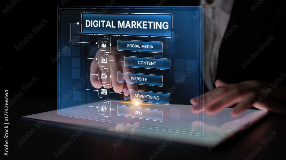 Tableau sur toile Digital marketing strategy broken down into categories: web, SEO, content, social media, and advertise