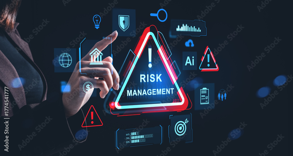 Tableau sur toile Businesswoman interacting with digital risk management hologram interface on dark background, representing futuristic data security concept