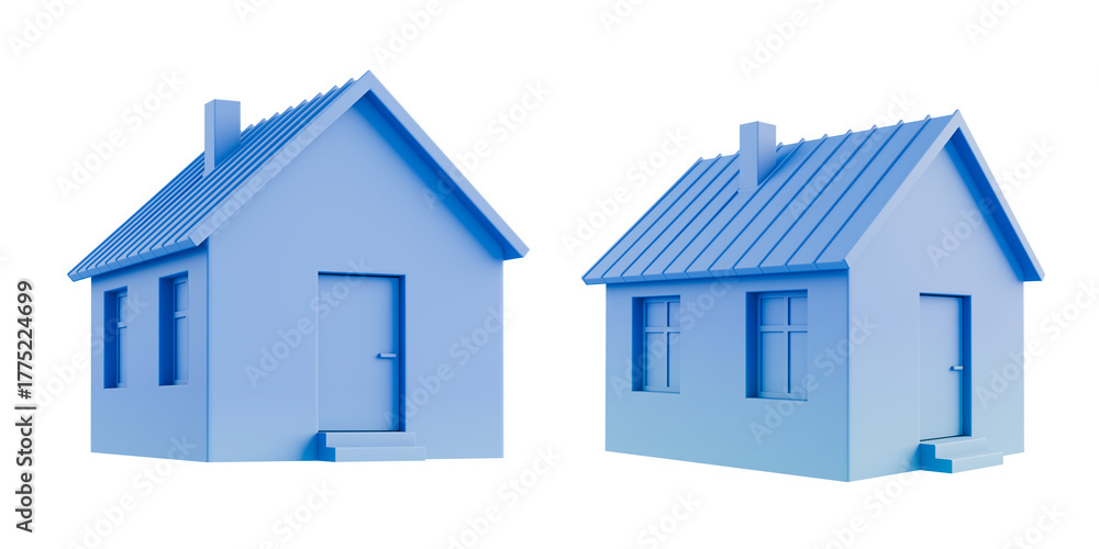 Tableau sur toile Two minimalist blue house models with gabled roofs and chimneys isolated on a white background