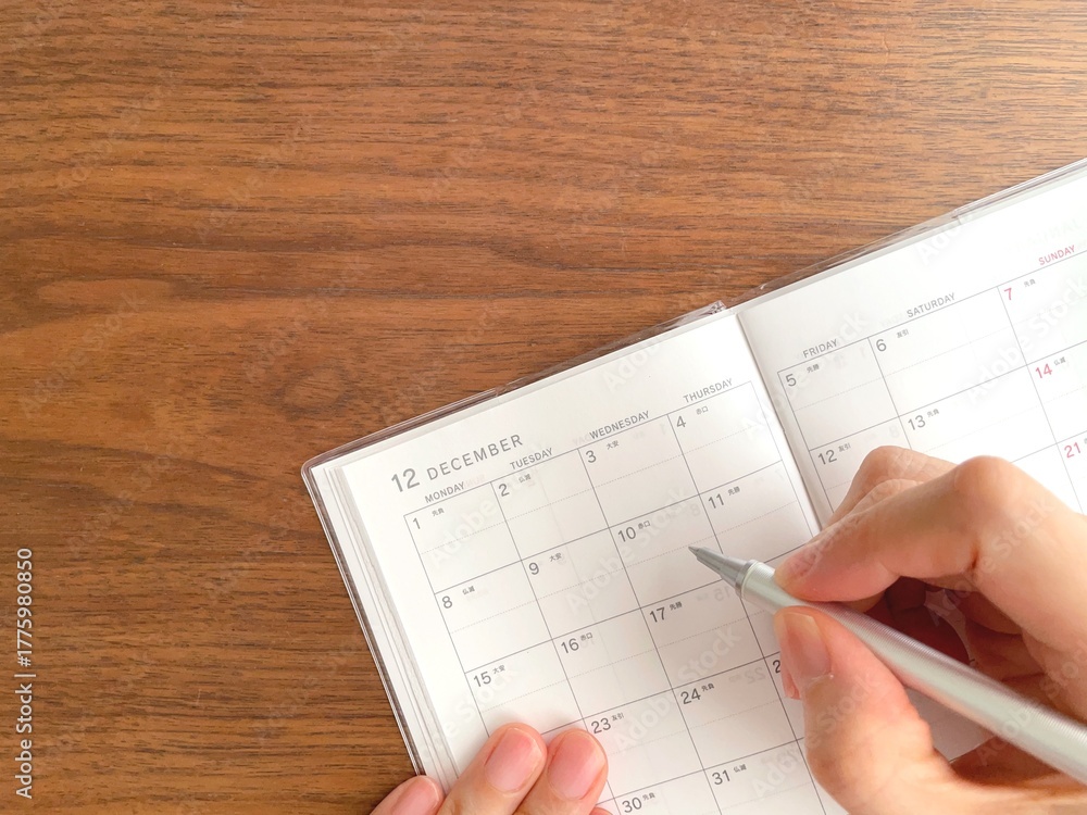 Tableau sur toile Woman's hand filling out a December schedule book on a wooden table