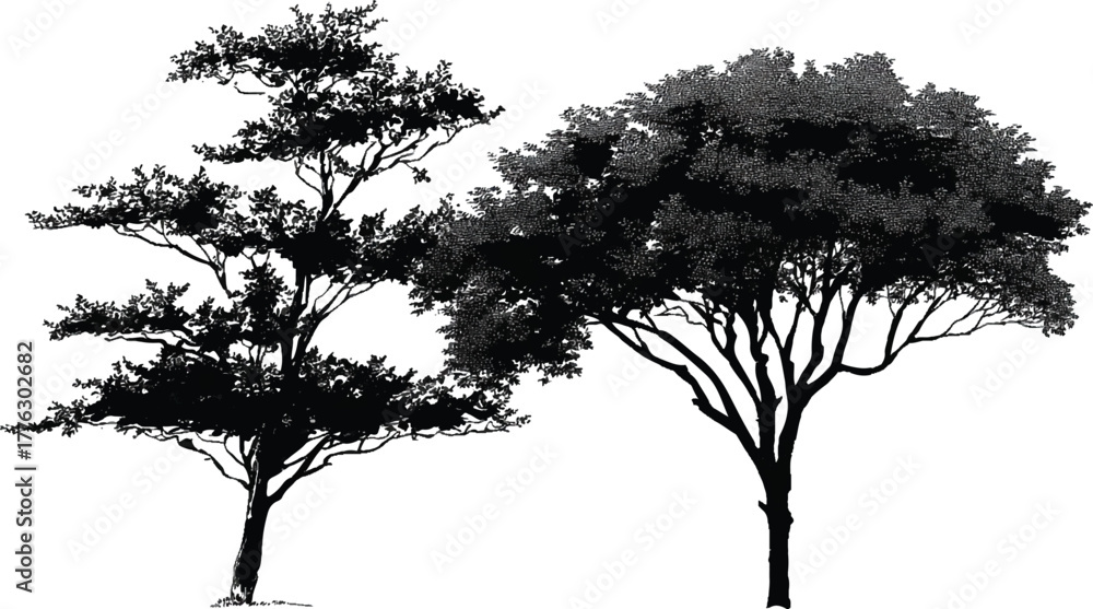 Tableau sur toile Monochrome silhouette of two deciduous trees on grassy horizon, sparse and dense canopies contrasting against white sky