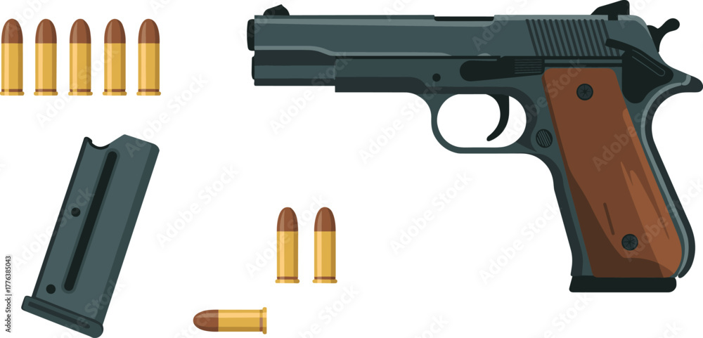 Tableau sur toile Realistic digital illustration of handgun pistol with ammunition bullets and mag