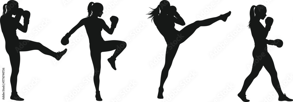 Tableau sur toile Silhouette of woman kickboxing in different poses, martial arts training, female