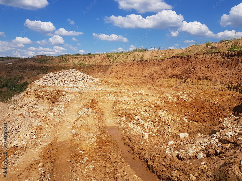 Tableau sur toile An open-pit quarry under a vibrant blue sky, featuring a large pile of crushed rock and reddish-brown earth with vehicle tracks