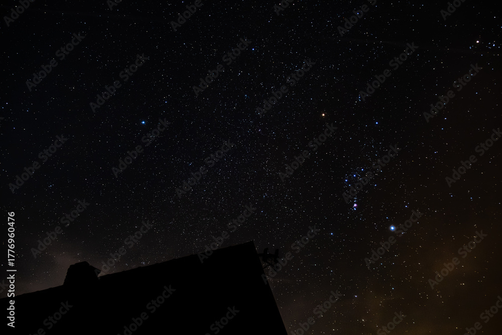 Tableau sur toile Beautiful night sky filled with stars and a rural cottage beneath it