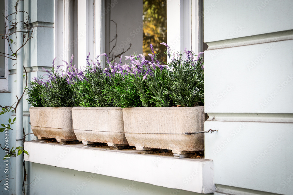 Tableau sur toile Window with Potted Lavender Plants on Building Exterior