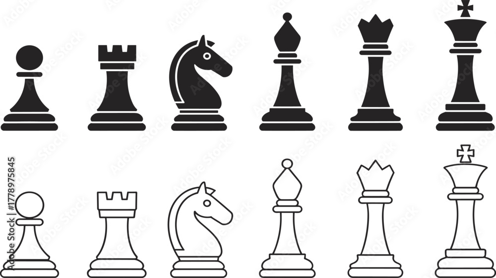 Tableau sur toile Black and white chess pieces vector illustration, strategic game icons set including pawn, rook, knight, bishop, queen, and king design