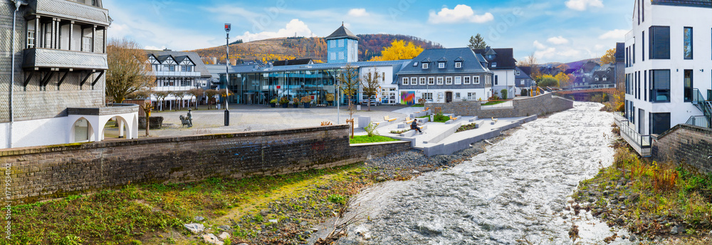Tableau sur toile Bad Berleburg marketplace with modern glass facade, half timbered houses, stream