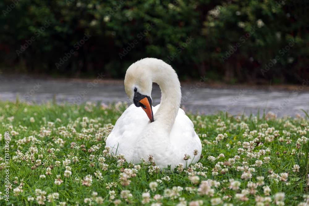 Tableau sur toile Cigno bianco che si pulisce accovacciato su un prato fiorito