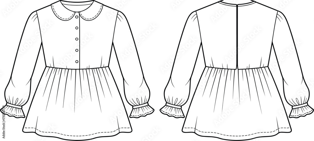 Tableau sur toile Cute girl long sleeve dress sketch, front and back technical flat, ruffle cuffs,