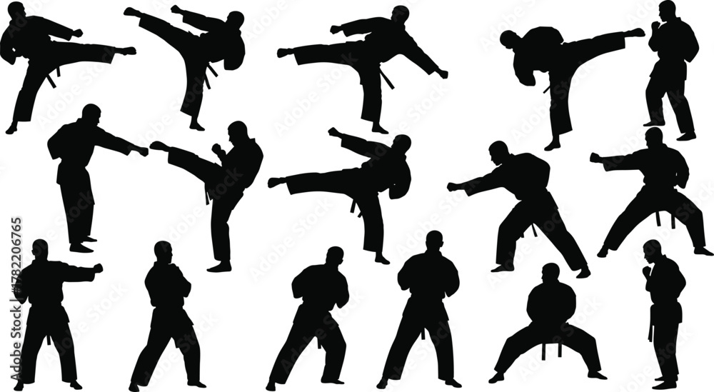 Tableau sur toile Silhouette martial artists, dynamic action poses, black outline figures, traditi