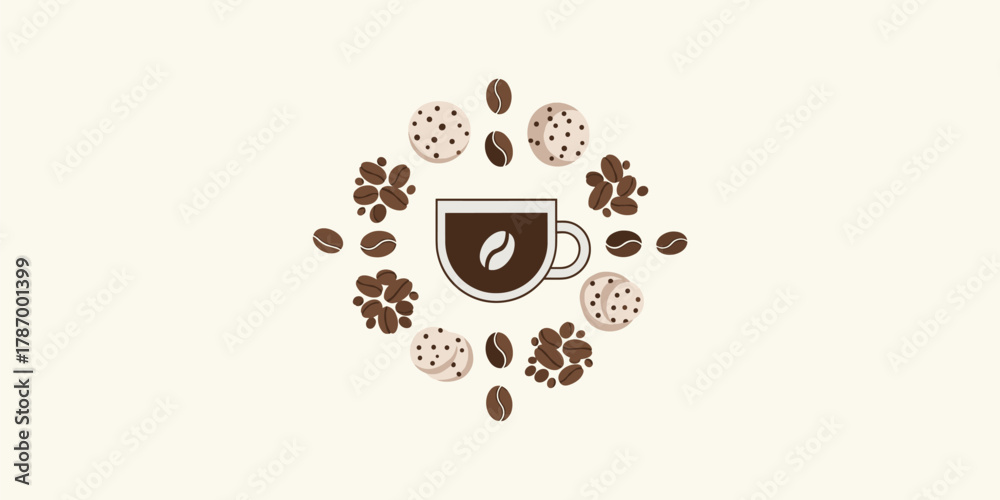 Tableau sur toile Coffee cup illustration with coffee beans and cookies around in a circular compo