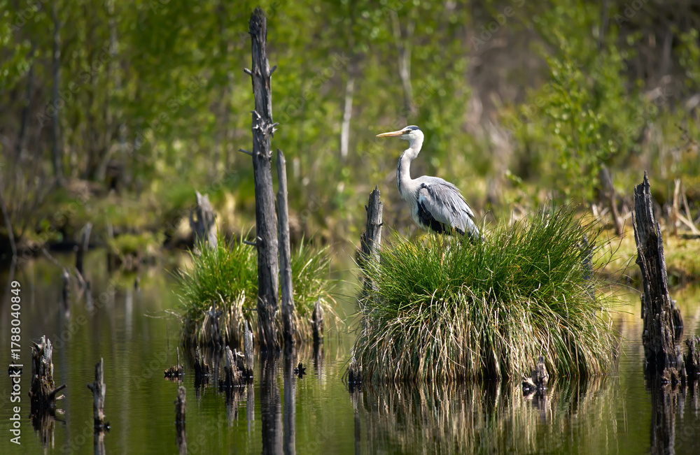 Tableau sur toile Graureiher (Ardea cinerea) steht inmitten einer Moorlandschaft mit Totholz, Gras