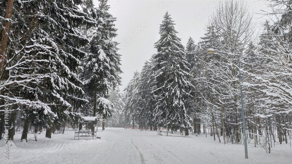 Tableau sur toile In winter, the ground, trees and gazebos in the park are covered with snow