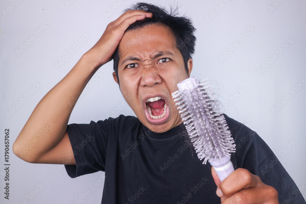 Tableau sur toile funny expression of angry asian man holding comb, problem hair, hair loss