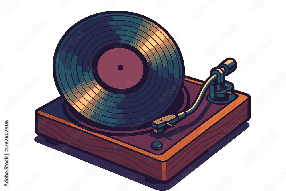 Tableau sur toile Isometric view of a retro turntable playing a large vinyl album disc in warm col