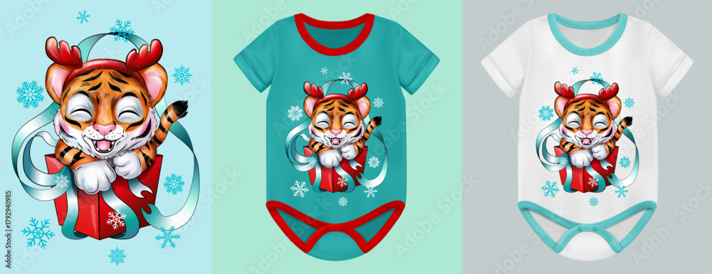 Tableau sur toile Cute Christmas tiger jumping out of a gift box with snowflakes for printing on a