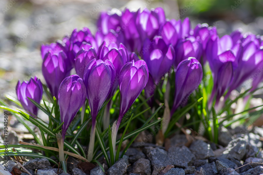 Tableau sur toile Bouquet of flowering crocus vernus bright purple violet plants, group of colorfu