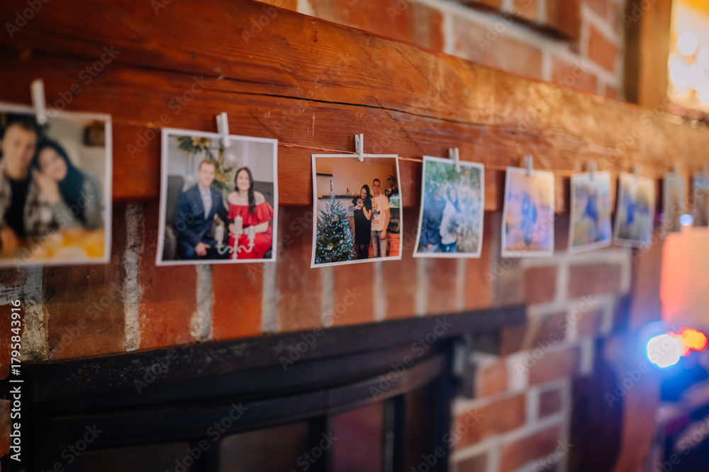 Tableau sur toile Colorful collection of photographs hanging on a wooden beam above a cozy firepla