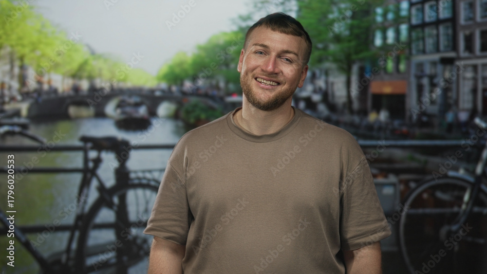Tableau sur toile Man with beard smiles on street in amsterdam canal area with bicycles and bridge; contentment leisure