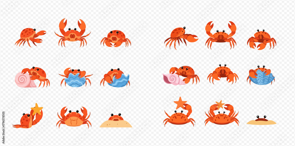 Tableau sur toile Collection of cute cartoon crabs in various poses, some interacting with seashells and sand, on a transparent background