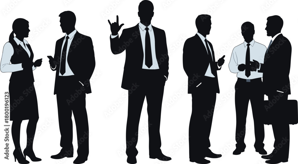 Tableau sur toile Five business people silhouettes in dark suits and light shirts interacting on w