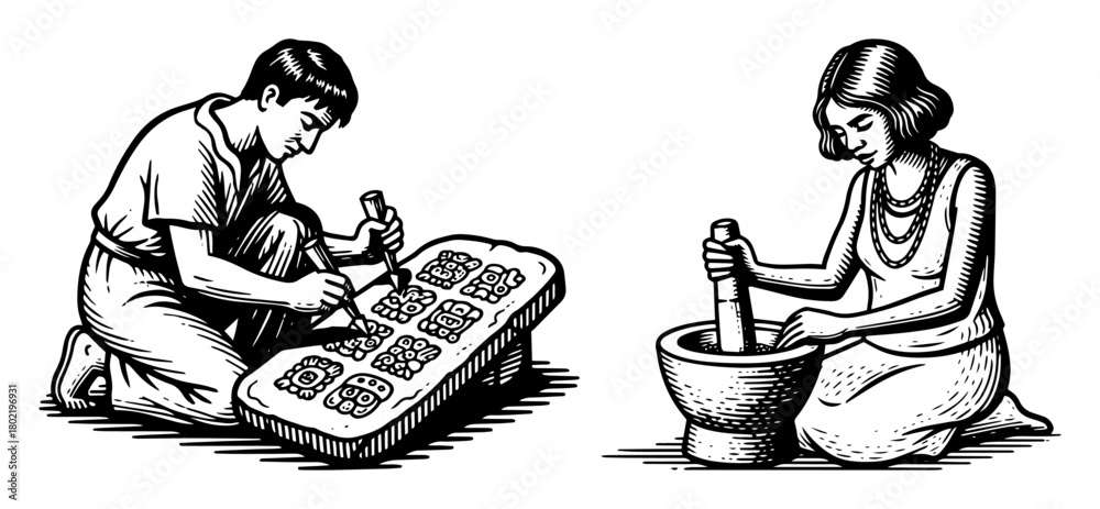 Tableau sur toile ancient civilization people carving and grinding food vintage illustration