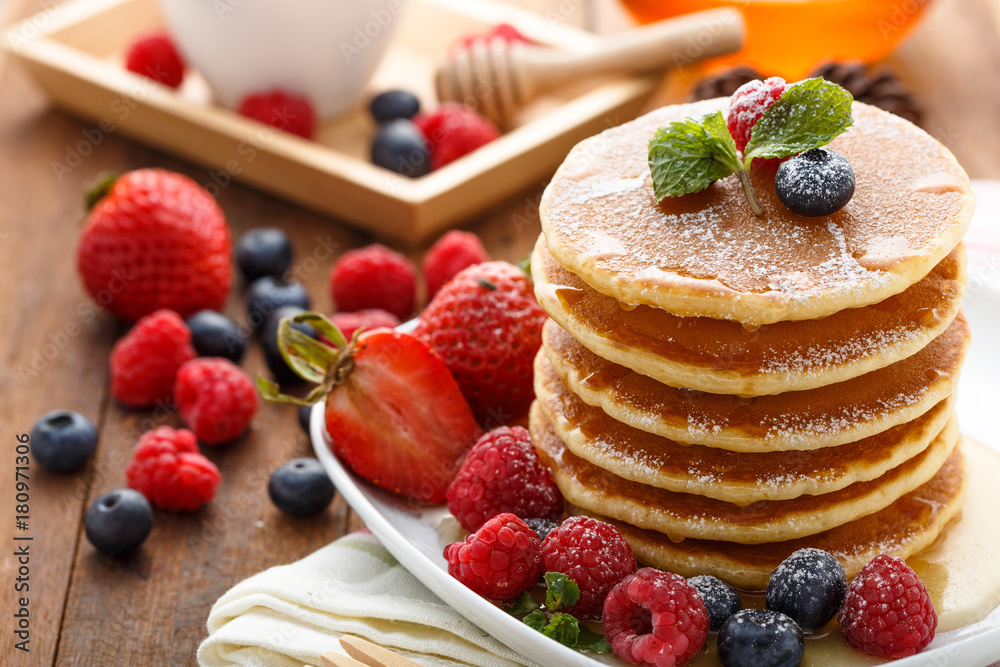 Tableau sur toile Mixed berry pancake with honey on wooden table