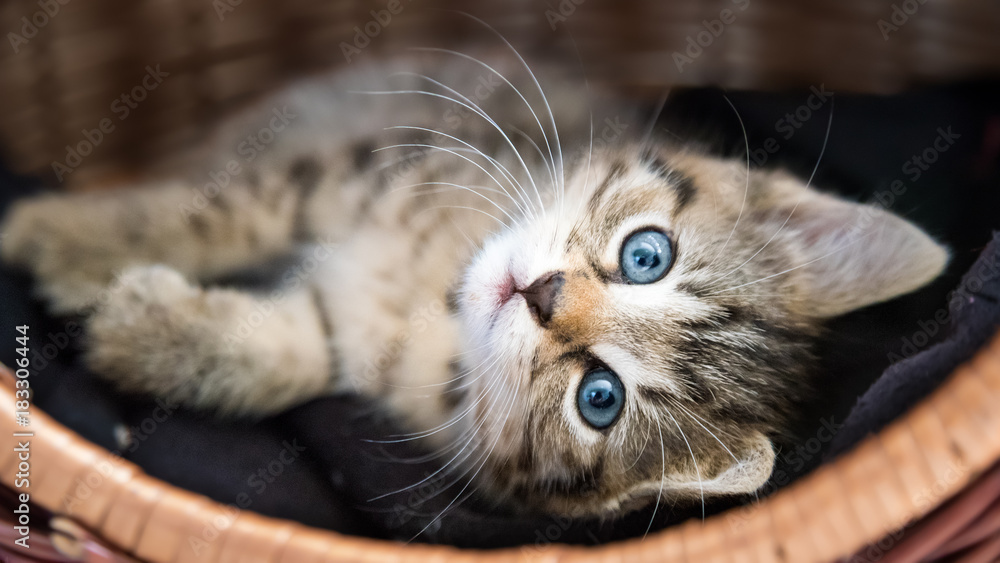 Tableau sur toile kleine Katze kuschelt im Körbchen
