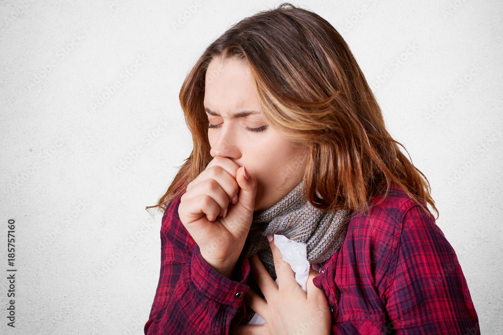 Tableau sur toile Studio shot of beautiful young female model has bad cough, uses tissue, wears scarf on neck, feels unwell and unhealthy, isolated over white concrete background