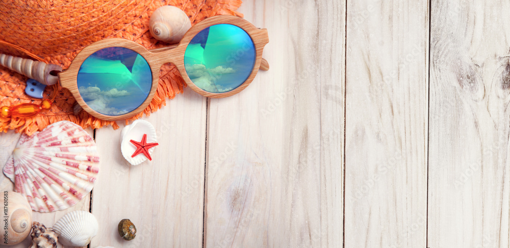 Tableau sur toile beach accessories glasses hat cockleshells