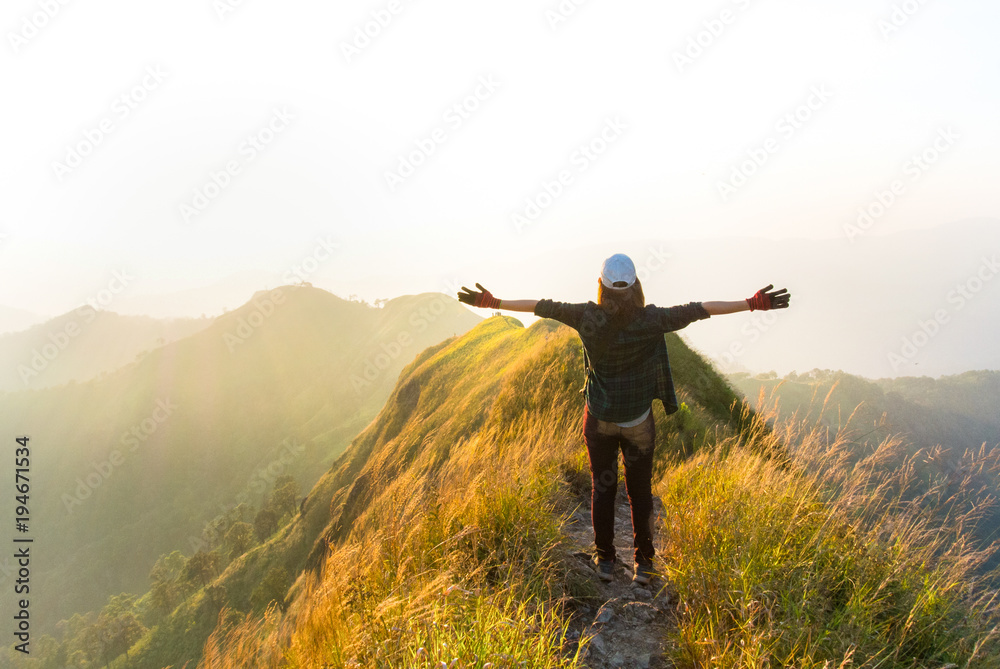 Tableau sur toile Happy woman traveler raised arms on top of mountain, feel freedom and enjoy nature