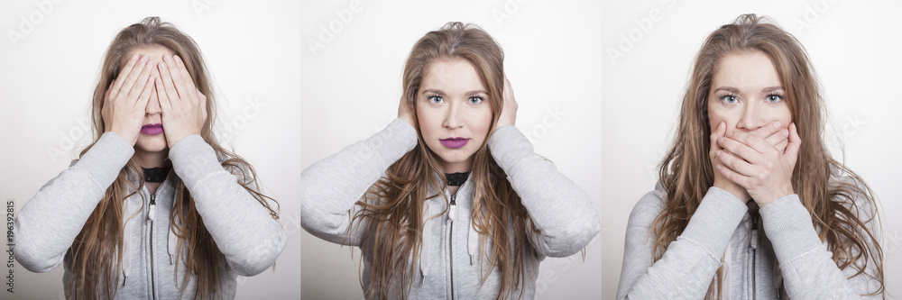 Tableau sur toile Frau gestikuliert Konfuzius' Paraphrasen: das Böse nicht sehen, nicht hören, nic