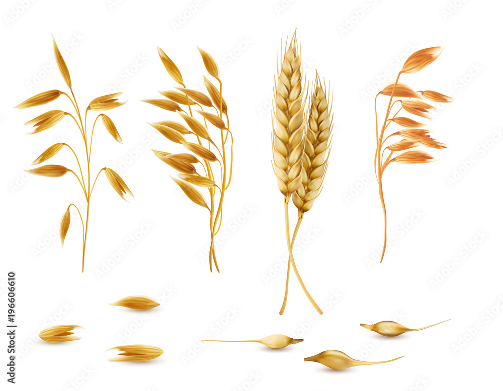 Vector realistic set of cereal plants, oat spikelets, barley ears, wheat or rye with grains isolated on background. Agriculture crop cultivated for healthy food, porridge, flakes, diet brans, muesli