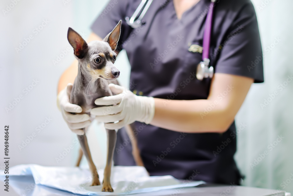 Tableau sur toile Female veterinarian doctor using stethoscope during examination dog in veterinar
