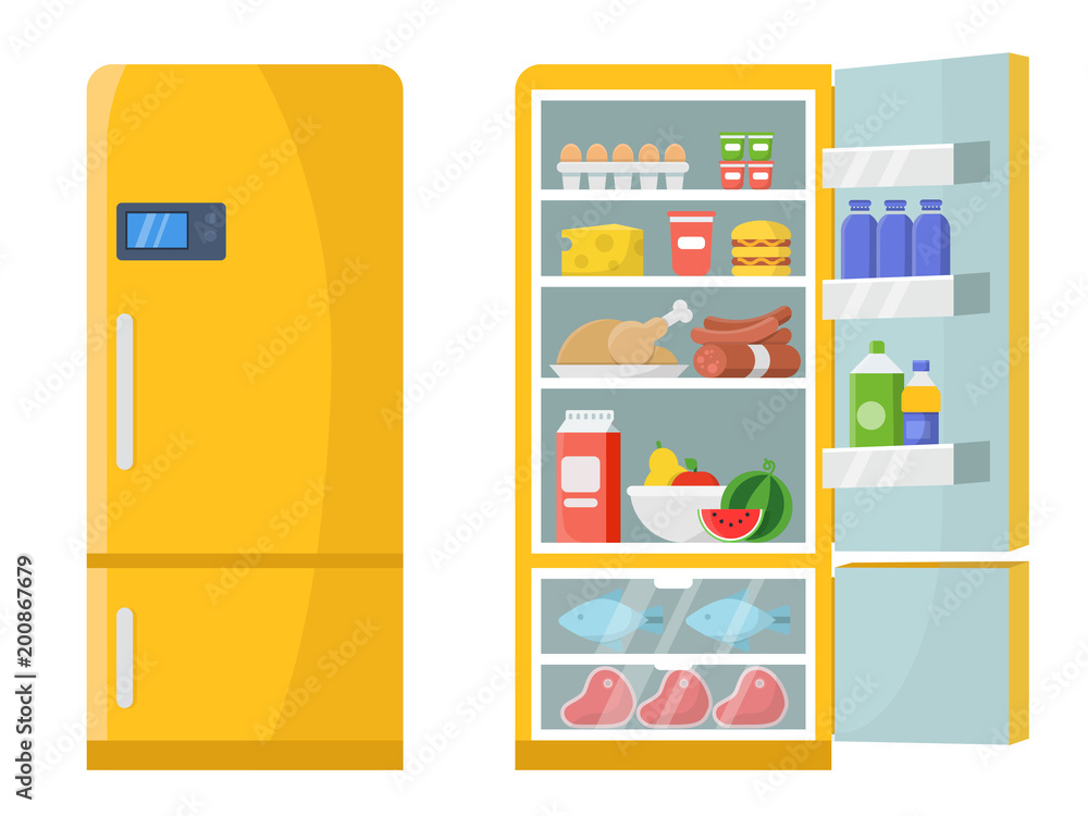 Tableau sur toile Vector illustrations of empty and closed refrigerator with different healthy foo