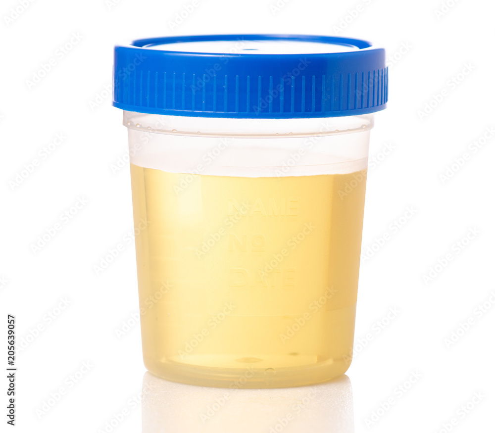 Tableau sur toile Plastic container with urine analysis on white background isolation