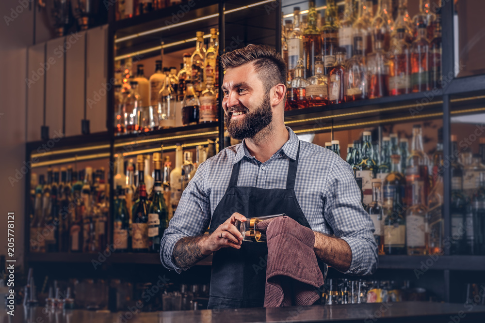 Tableau sur toile Cheerful stylish brutal barman is cleaning the glass with a cloth at bar counter background