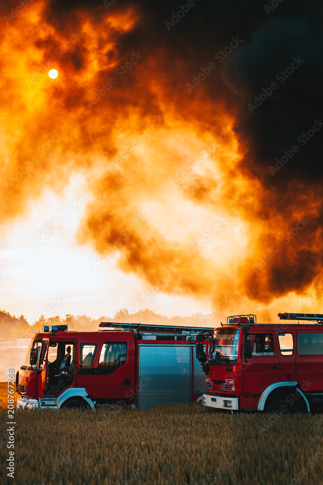 Tableau sur toile Red fire trucks in front of huge black smoke from the fire