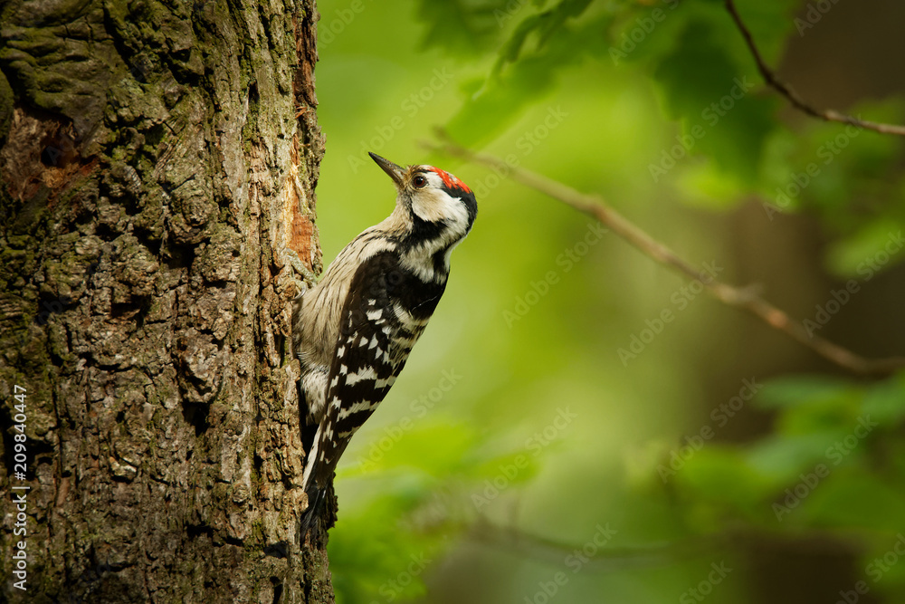 Tableau sur toile Lesser Spotted Woodpecker - Dendrocopos minor feeding his chicks in the nesthole