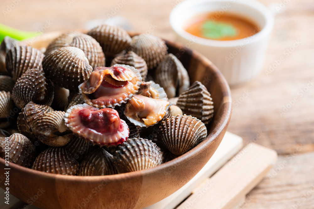 Tableau sur toile Steamed cockle ( Boiled cockles ) with spicy seafood sauce