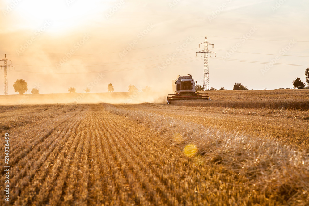 Tableau sur toile Ein Mähdrescher erntet Getreide in der Abendsonne