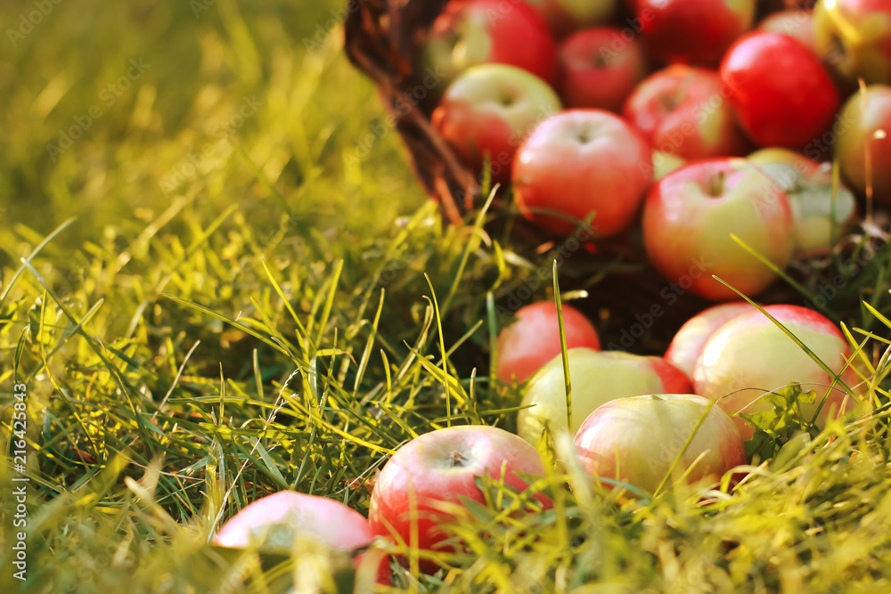 Tableau sur toile Blurred fresh apples in basket and on grass